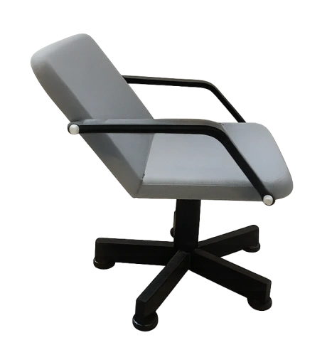 This backwash chair features a sleek grey seat and backrest with armrests and 5 wheeled base. Designed to resemble a salon backwash chair.