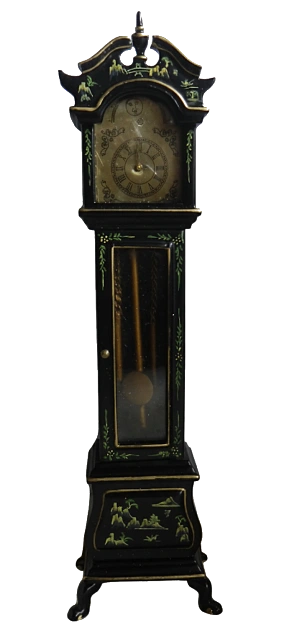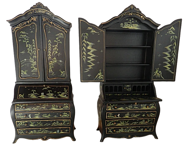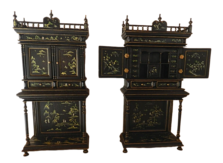 Add a touch of vintage charm with this beautifully detailed black and gold cabinet featuring intricate hand-painted Asian motif designs with opening doors - drawers and shelving perfect for a classic dolls house interior.