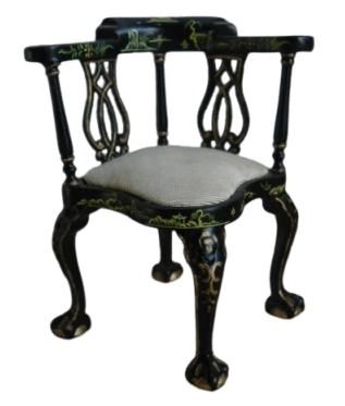 Elegant black framed chair with delicate hand painted gold and green detailing on an ornate backrest design with curved legs complete with claw feet and light cream upholstery.