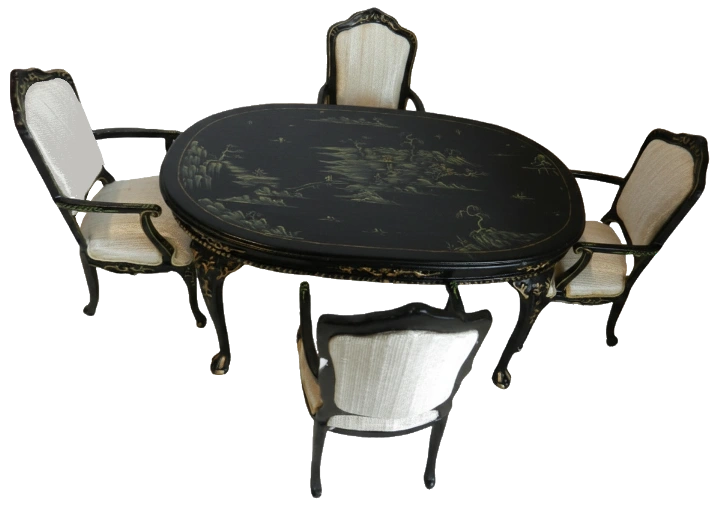 Elegant miniature dining set. An Oval black lacquered style table with delicate hand painted gold detailing and four matching chairs. The chairs feature cream upholstered seats and backs framed in black with gold accents for a refined classic look.