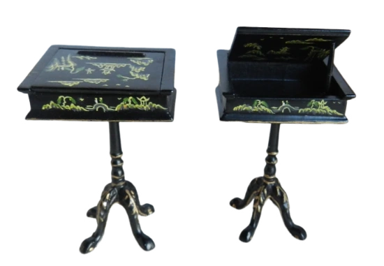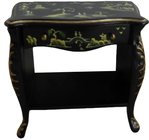 This elegant bedside cabinet is a perfect addition to any dollhouse bedroom. Finished in black lacquer with fine hand painted gold detailing - it features a decorative top with curved legs and a lower shelf for added charm.