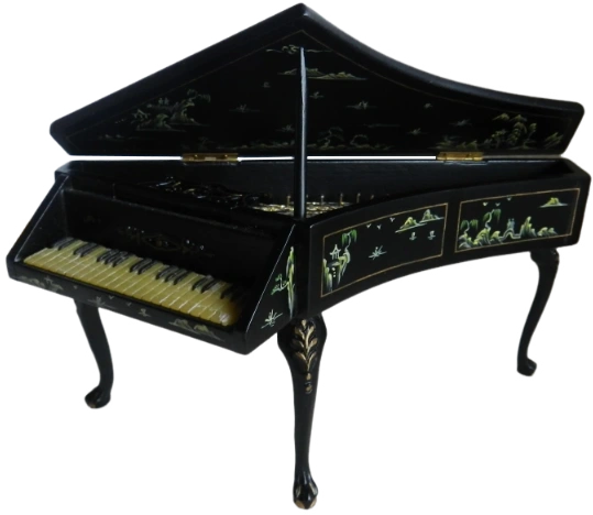 Elegant harpsichord that is beautifully crafted with a glossy black finish and delicate hand painted oriental-style detailing. The lid opens to reveal the intricate interior and painted keys which add charm and authenticity.