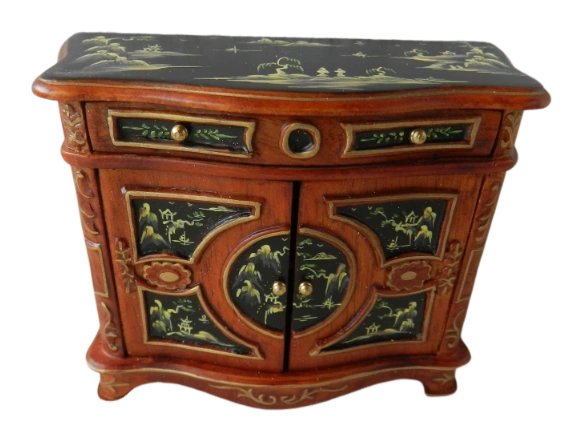 Elegant miniature sideboard with intricate hand painted detailing. Featuring a rich wood-tone finish with two drawers and double doors. This piece is beautifully decorated with black lacquer-style panels depicting delicate golden scenes.