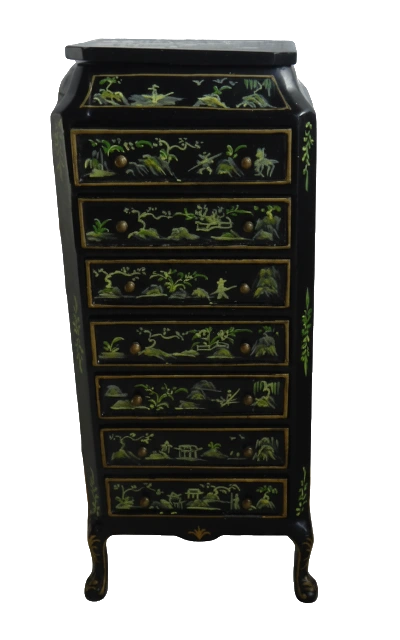 Beautiful miniature black lacquer chest of drawers with 6 working drawers - each hand decorated with intricate gold and green Oriental-style designs.