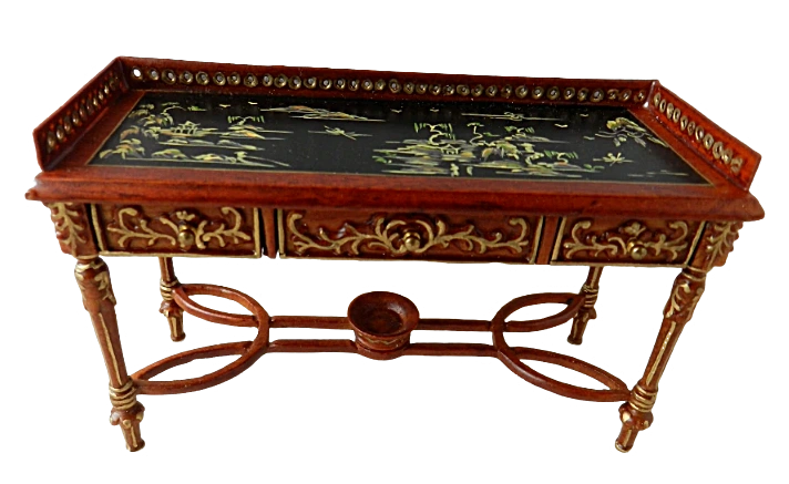 Features 2 small top drawers and 1 large lower drawer that are all accented with fine gold trim. The open shelf and curved legs add a touch of classic charm making it a perfect addition to a traditional or vintage-style dollhouse setting.