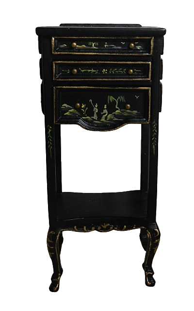Elegant black lacquer side cabinet with delicate hand-painted floral detailing.