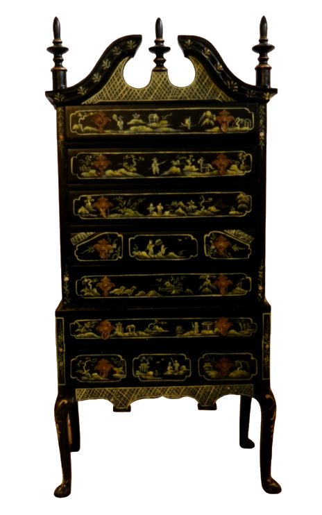Beautiful dolls house tallboy chest of drawers. Finished in black with intricate hand-painted oriental-style designs in gold and green. Features 6 detailed drawers and elegant cabriole legs.