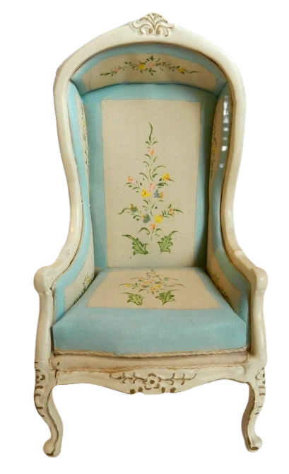 This exquisite miniature dollhouse chair is a charming addition to any collection featuring a classic high-back design with elegant curves and delicate carved details on the frame. Upholstered in a soft light blue fabric accented with a contrasting cream panel on the back and seat both adorned with beautifully hand-painted floral motifs in vibrant colours.