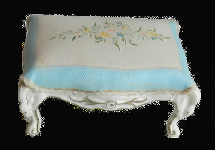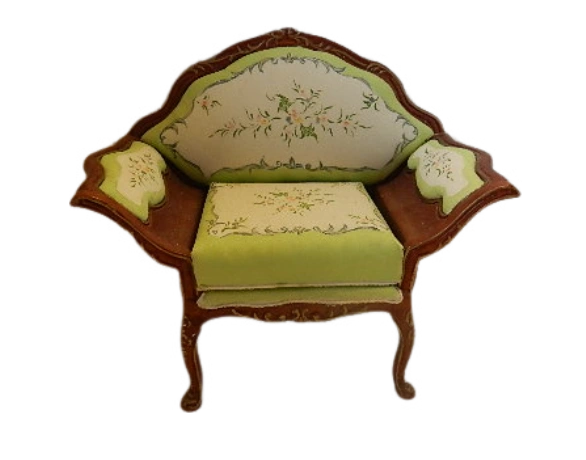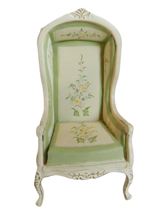 Add a touch of vintage charm to your space with this exquisite miniature chair featuring elegant curved legs with a plush upholstered seat and delicate hand-painted floral details this piece is perfect for dollhouses or a unique accent to any room.