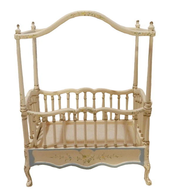 This charming miniature dollhouse crib adorned with delicate hand-painted floral details which adds a touch of vintage elegance to any tiny nursery. A perfect item for a dollhouse nursery.