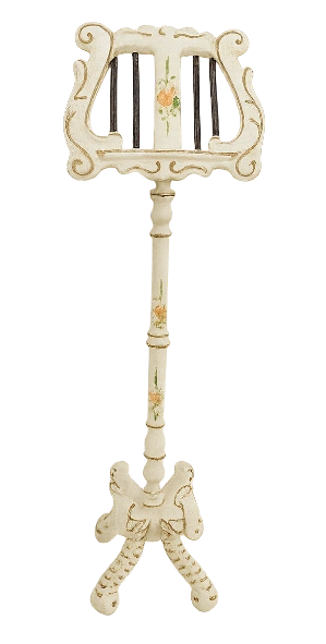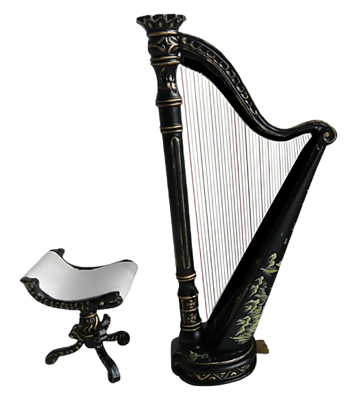 Elegant harp with stool ? a beautiful decorative piece for any dollhouse music room. The black harp is detailed with gold accents and delicate painted floral motifs and is paired with a matching cushioned stool.