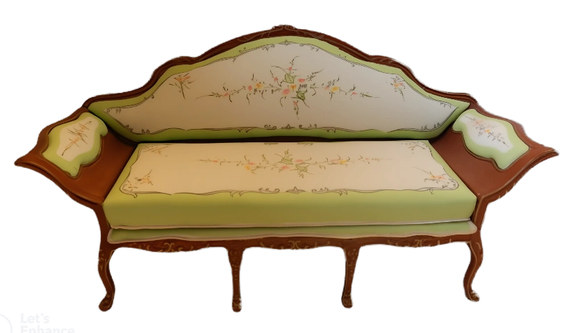 Exquisite handcrafted sofa or settee features rich walnut-wooden frame with intricate carvings that visibly stand out along the top of the scroll arms and backrest. Boasts classic cane panels on the back and arms and complemented by a comfortable upholstered seat in green satin patterned fabric. This antique-style piece is a perfect addition to any dollhouse miniature collection adding elegance and historical charm.