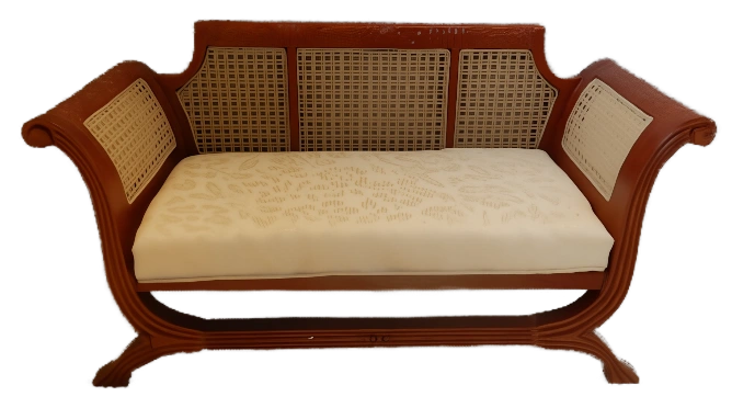 Exquisite handcrafted sofa or settee features rich walnut-wooden frame with intricate carvings that are particularly visibly noticeable along the top of the scroll arms and backrest. Boasts classic cane panels on the back and arms complemented by a comfortable upholstered seat in red-gold fabric. This antique-style piece is a perfect addition to any dollhouse miniature collection adding elegance and historical charm.