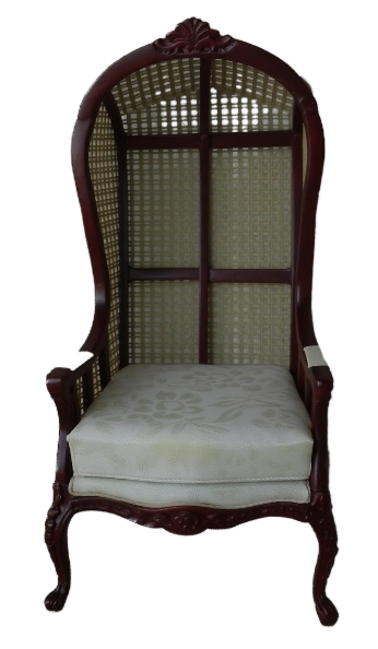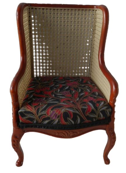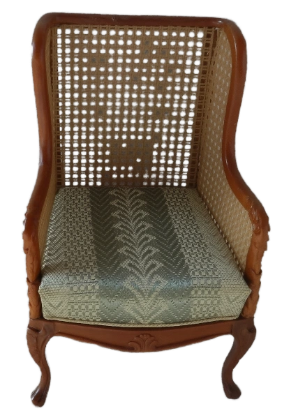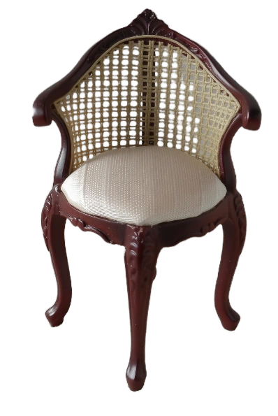 Monique BergŠre Style chair brings timeless elegance to any dollhouse. Features beautifully crafted mahogany-stained frame with delicate cabriole legs classic cane wicker back which exudes sophistication. The Plush upholstered seat cushion in a neutral tone offers a touch of comfort and refinement perfect addition to a miniature living room - study or bedroom.
