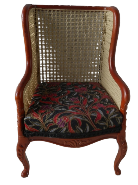 Exquisite Bergere Chair features a classic design with a rich mahogany finish and delicate cane wicker details on the back. The Chair is comfortable with an upholstered seat cushion making it a perfect addition to any dollhouse seeking a touch of elegance.