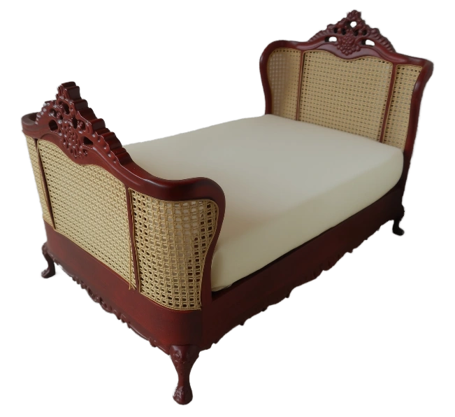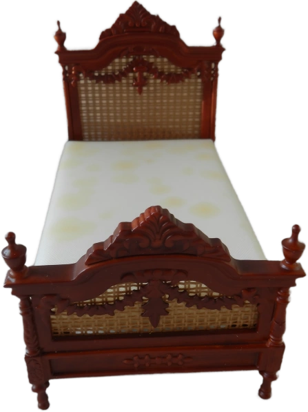 Charming dollhouse bed; crafted with intricate details featuring a rich mahogany-toned finish and delicate cane webbing on both headboard and footboard. Perfect for adding a touch of classic elegance to any dollhouse bedroom includes a simple mattress making it ready for your custom bedding designs.