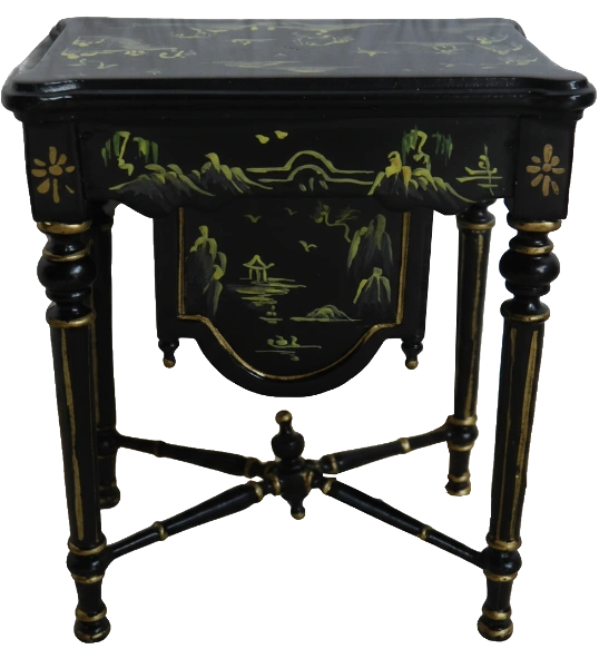 Exquisite side table finished in classic black with intricate hand-painted gold detailing. Features turned legs with a cross-stretcher base and oriental-inspired scenic artwork.