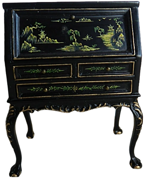 Elegant miniature black lacquer writing bureau that is beautifully hand-painted with delicate oriental landscape and floral designs in green and gold.